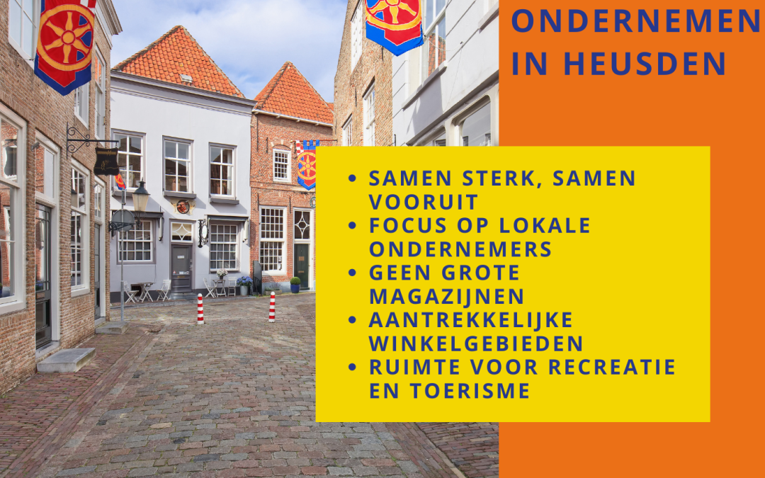 Heusden één zet in op een sterk ondernemersklimaat, een gemeente die meedenkt, openstaat voor ideeën en out of the box durft te denken, ondernemers actief betrekken bij plannen en ontwikkelingen. En steun en uitbreiding van samenwerkingsinitiatieven zoals Ondernemend Heusden.